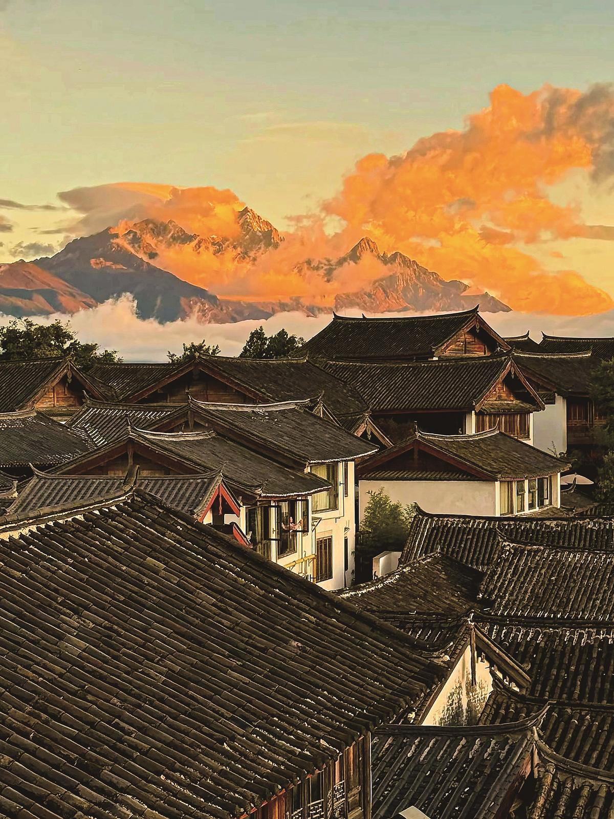 玉龙雪山下的东巴谷同样热闹,吸引了大批摄影爱好者。大家踩着晨露寻找最佳拍摄角度,力求记录下“金山”与周边景致相融的精美画面。