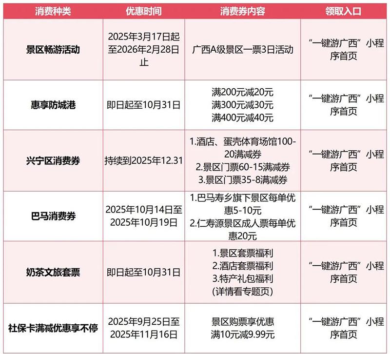 防城港、南宁兴宁区、河池巴马等地发放消费券,涵盖住宿、景区等多种消费场景,让游客住宿更省心、游玩更实惠。